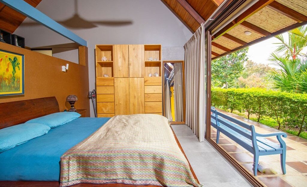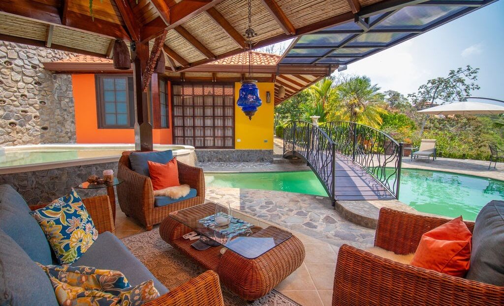 Cross over the swimming pool with the bridge that connects you to the bedroom pavilion.