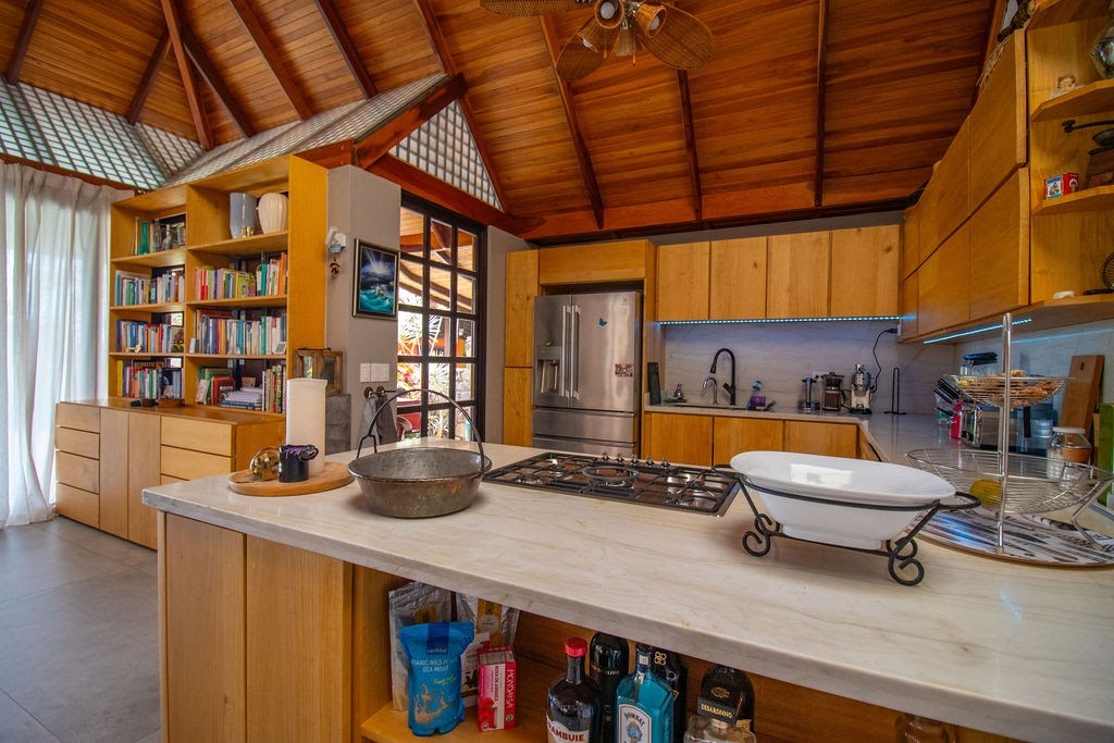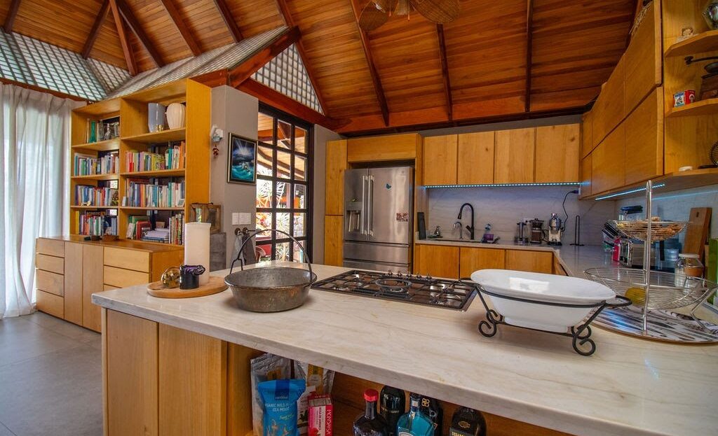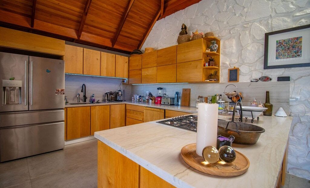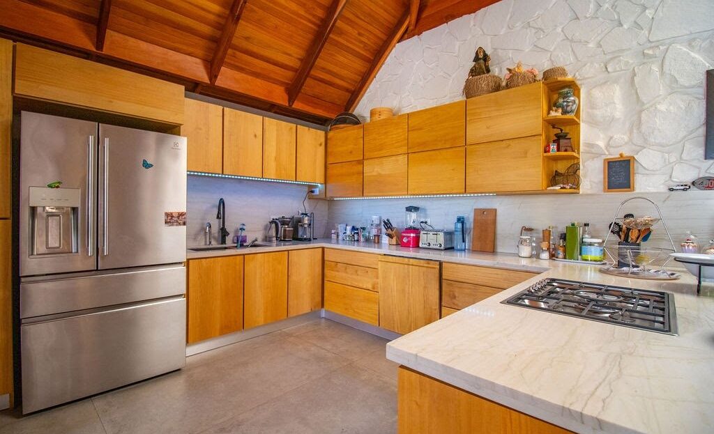 Los pabellones individuales crean una sensación de serena separación, perfecta tanto para la relajación como para el entretenimiento. Mientras pasea de un espacio a otro, déjese cautivar por las áreas comunes diseñadas con buen gusto. Imagínese organizar reuniones vibrantes en la sala de estar y el comedor, donde las puertas de vidrio del piso al techo desdibujan la línea entre el interior y las impresionantes vistas a las montañas. Prepare comidas deliciosas en la cocina de estilo europeo, que cuenta con una gran cantidad de gabinetes de color madera natural e impresionantes encimeras de mármol. La cocina cuenta con un amplio espacio de almacenamiento, lo que garantiza que todo tenga su lugar designado.