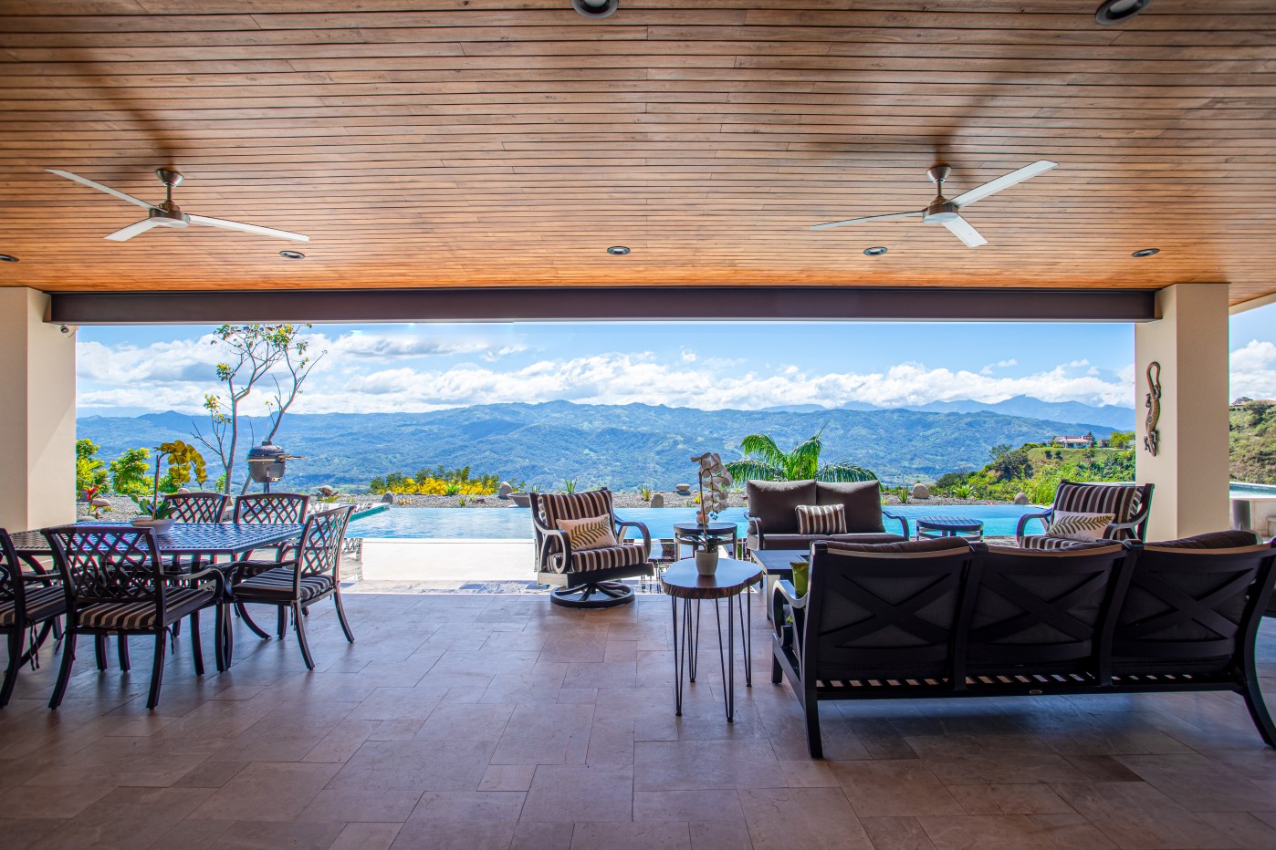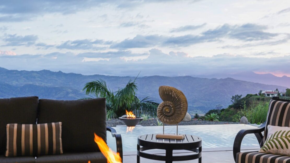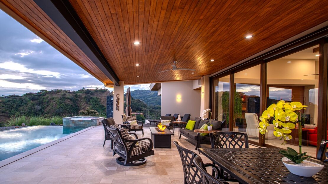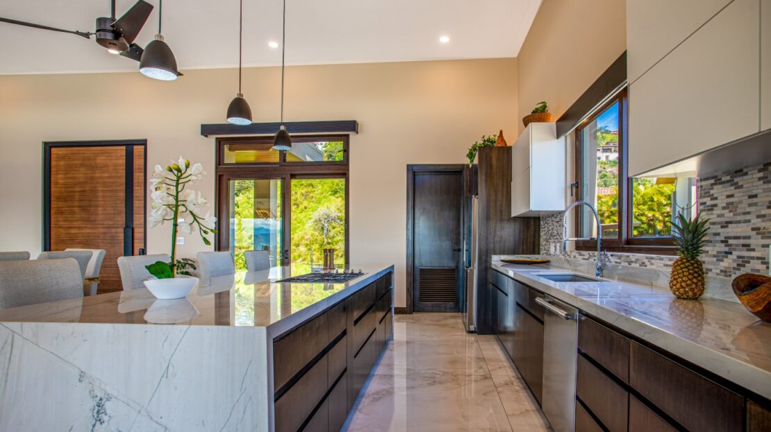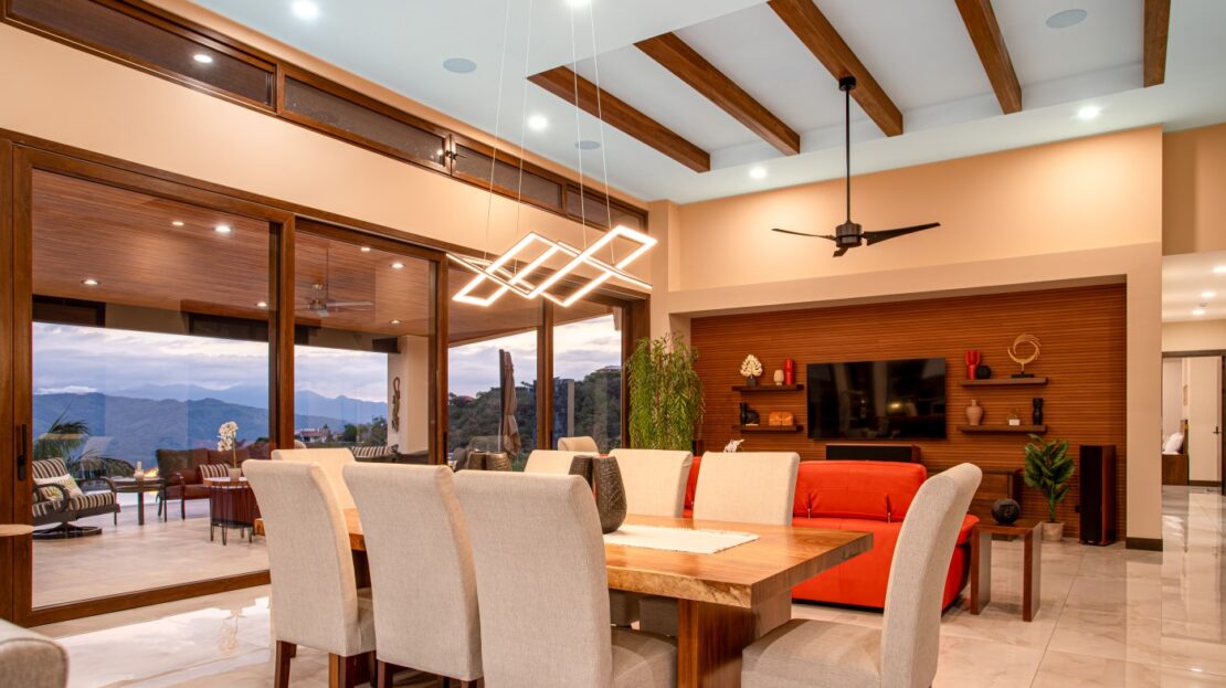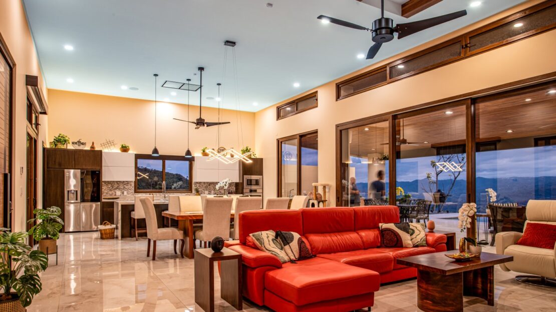 El espacio principal está decorado con muebles personalizados, hechos a mano, importados y costarricenses, incluida una gran mesa de comedor guanacasteca. Importados de Italia, un sofá y una silla de cuero para sala de estar también son tuyos.
