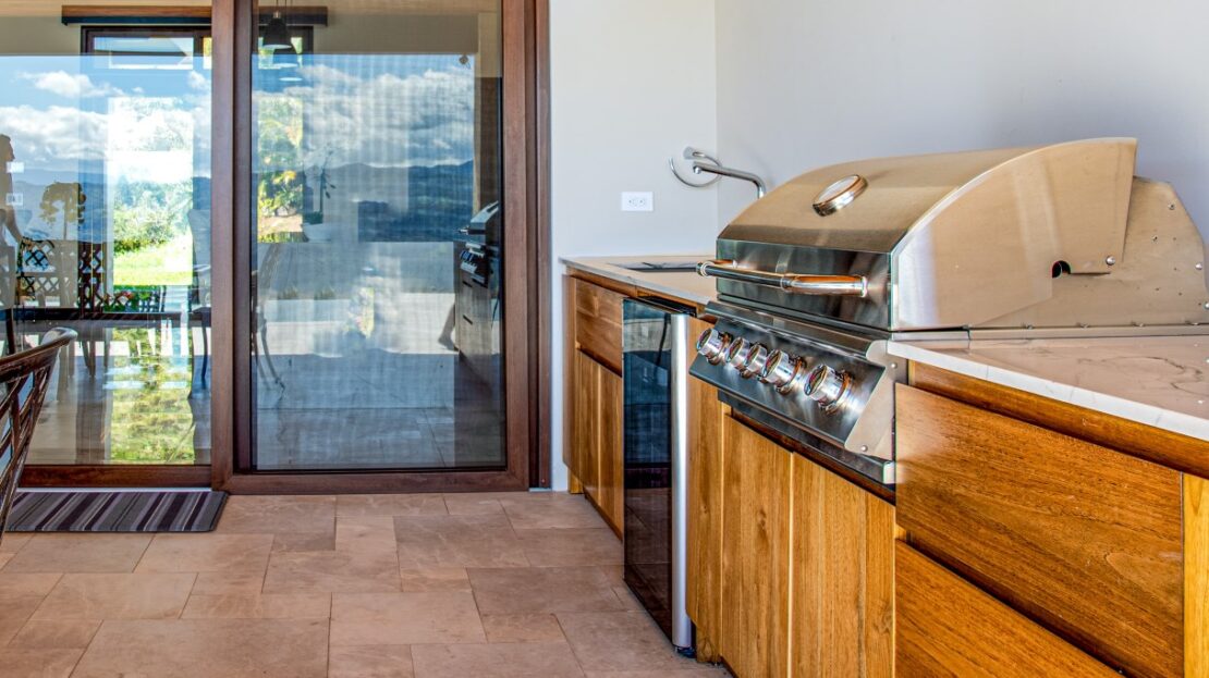 Pasando rápidamente al patio antes de continuar adentro, la cocina al aire libre está equipada con una barbacoa Bull de 36 pulgadas y cuatro quemadores con quemador infrarrojo y asador. También hay una barbacoa/ahumador estilo huevo de carbón. Un refrigerador de cerveza también llegó a la propiedad.