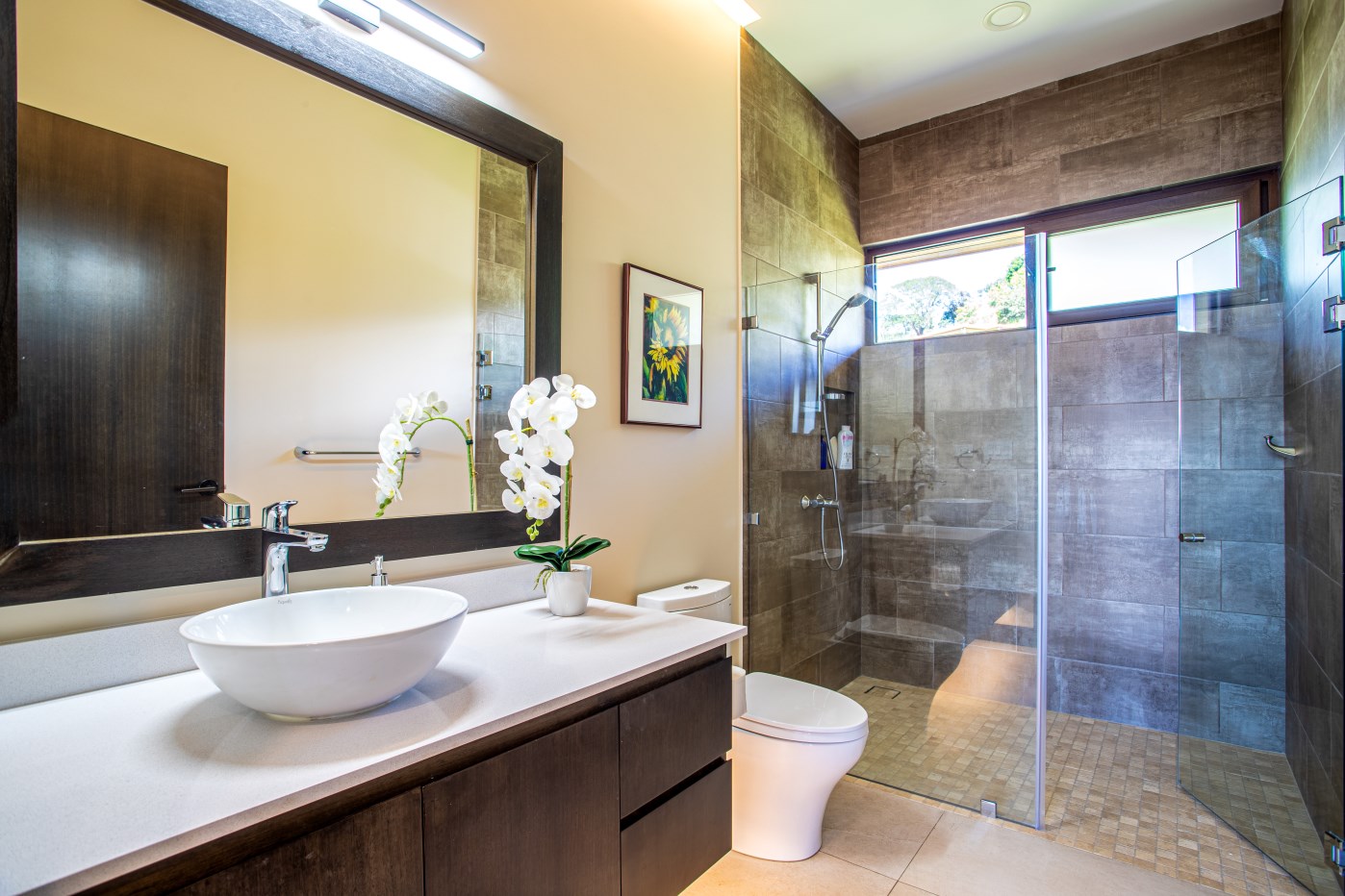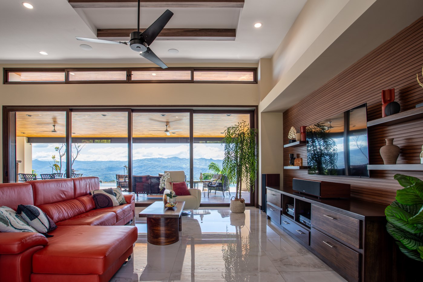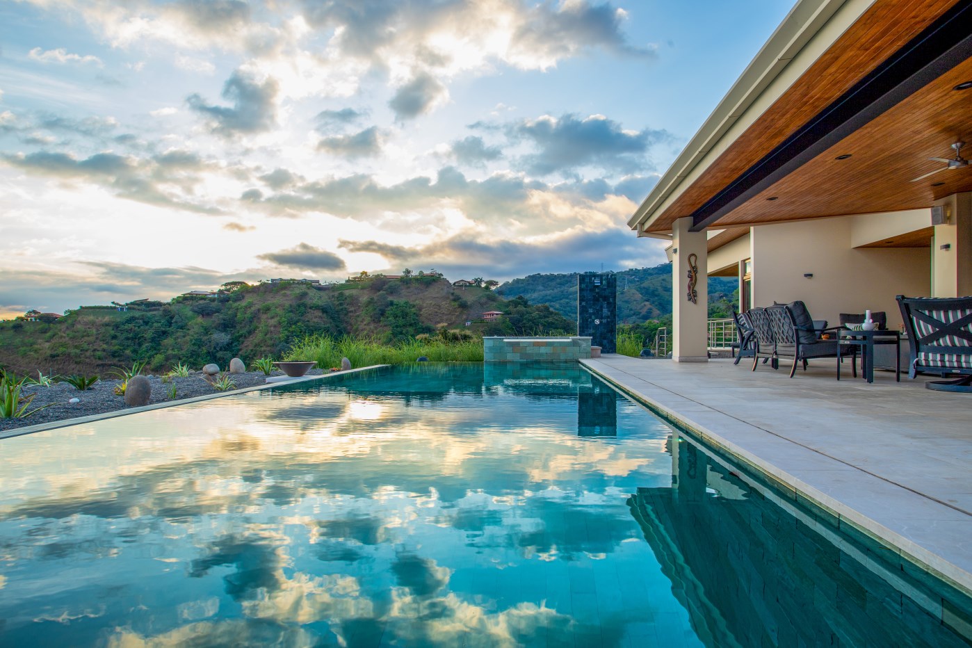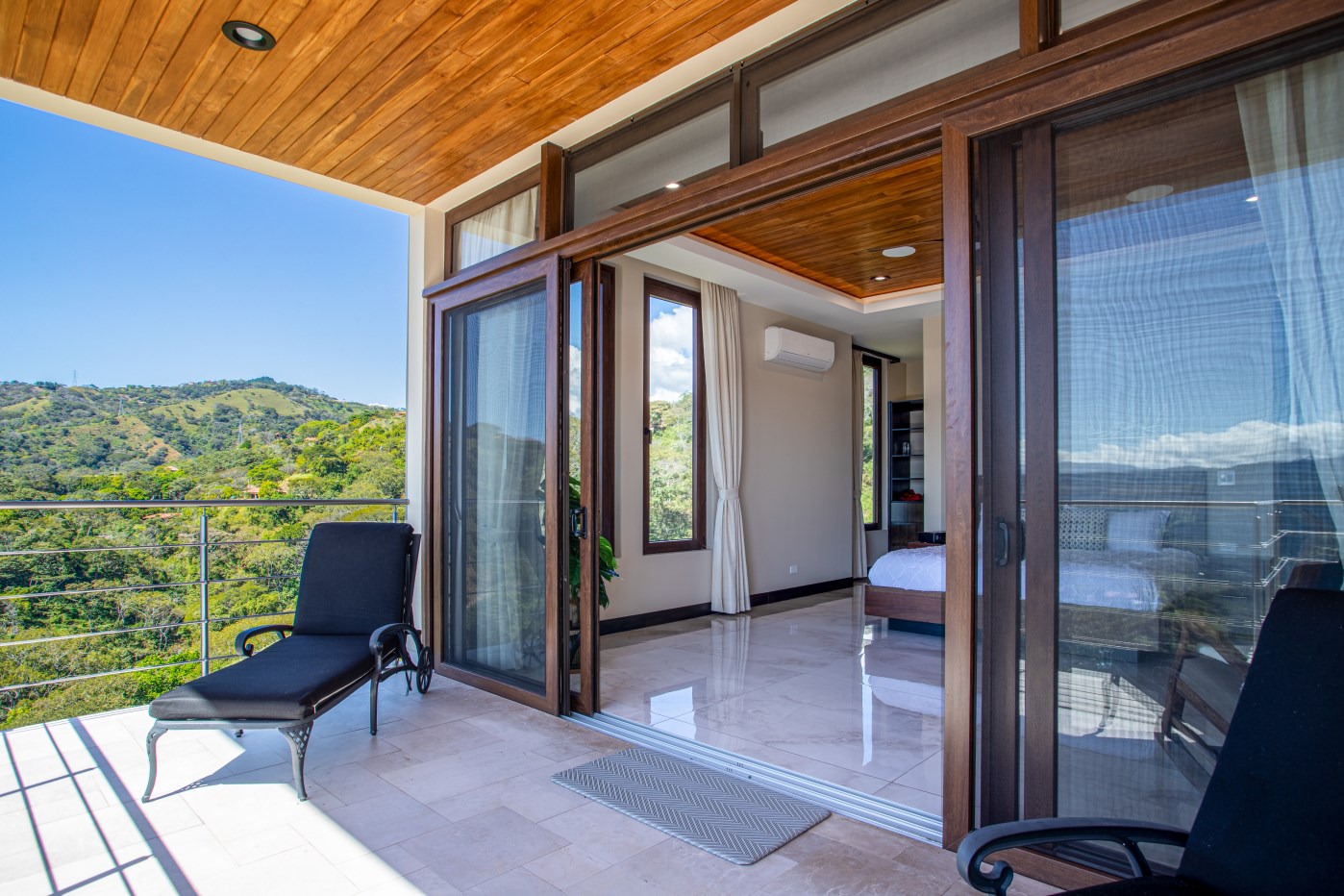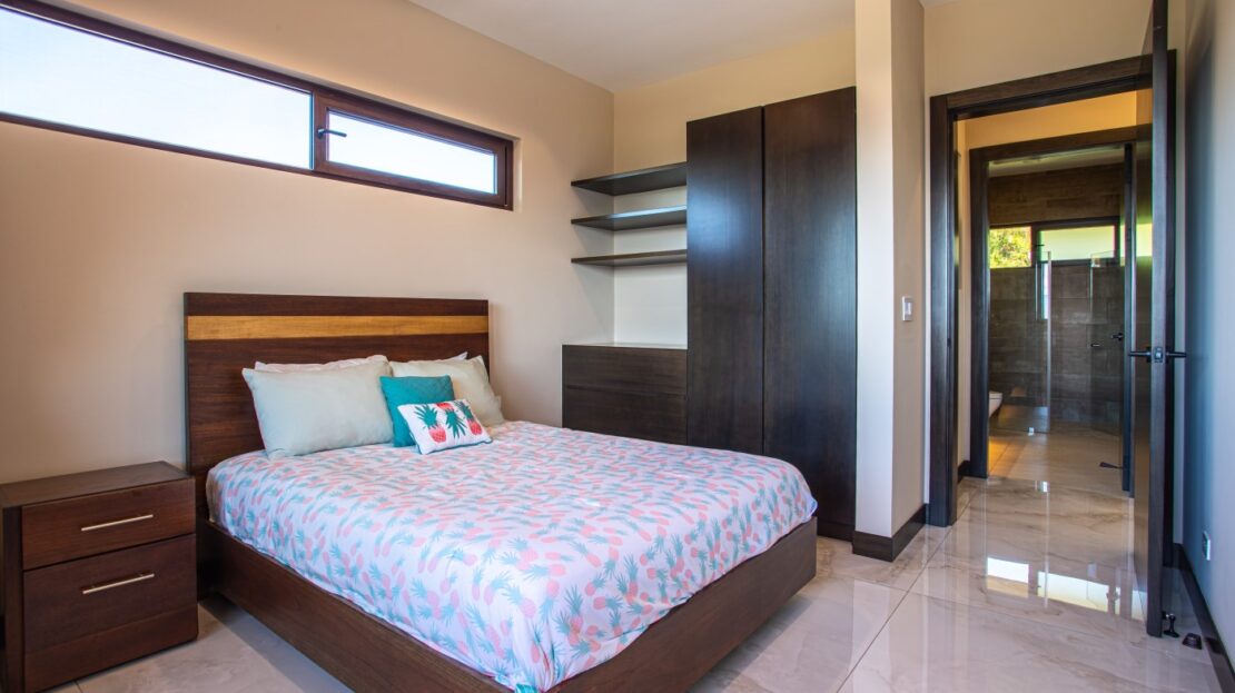 The primary living space is decorated with customized, hand-crafted imported and Costa Rican furniture, including a large Guanacaste dining room table. Imported from Italy, a living room leather sofa and chair are also yours.