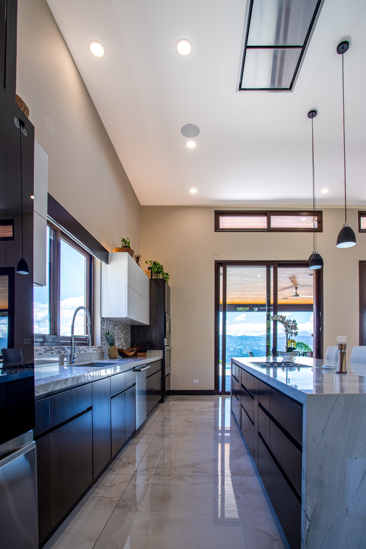 As you enter this very spacious house through a large, custom-wood pivot door, you’ll be greeted with an incredibly large, naturally lit, family room and gourmet kitchen.