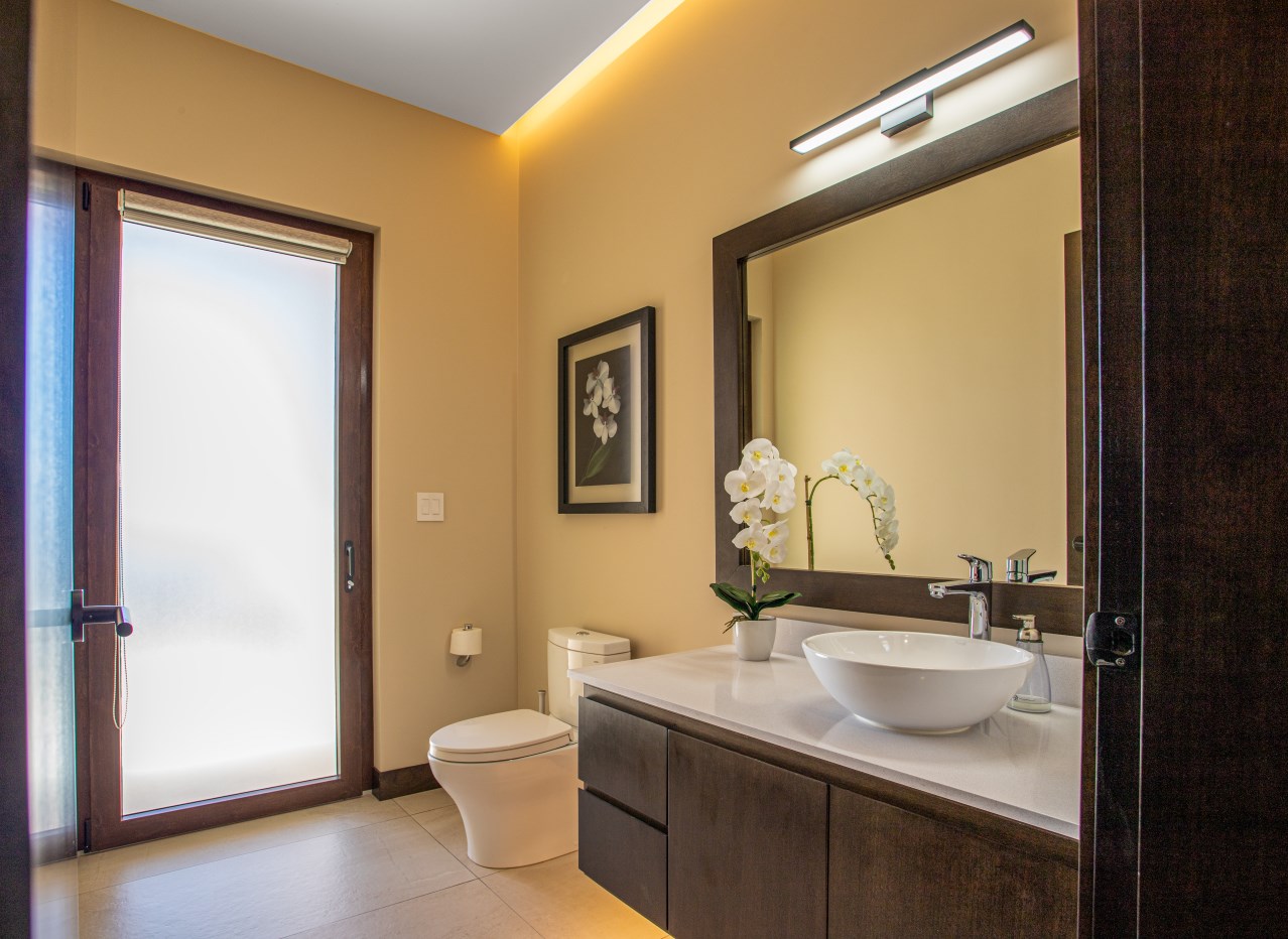 El amplio dormitorio principal con vestidor está equipado con una unidad de aire acondicionado split. El baño principal tiene un baño independiente, un gran tocador doble, una ducha doble sin vidrio con cabezal tipo lluvia y una bañera independiente.