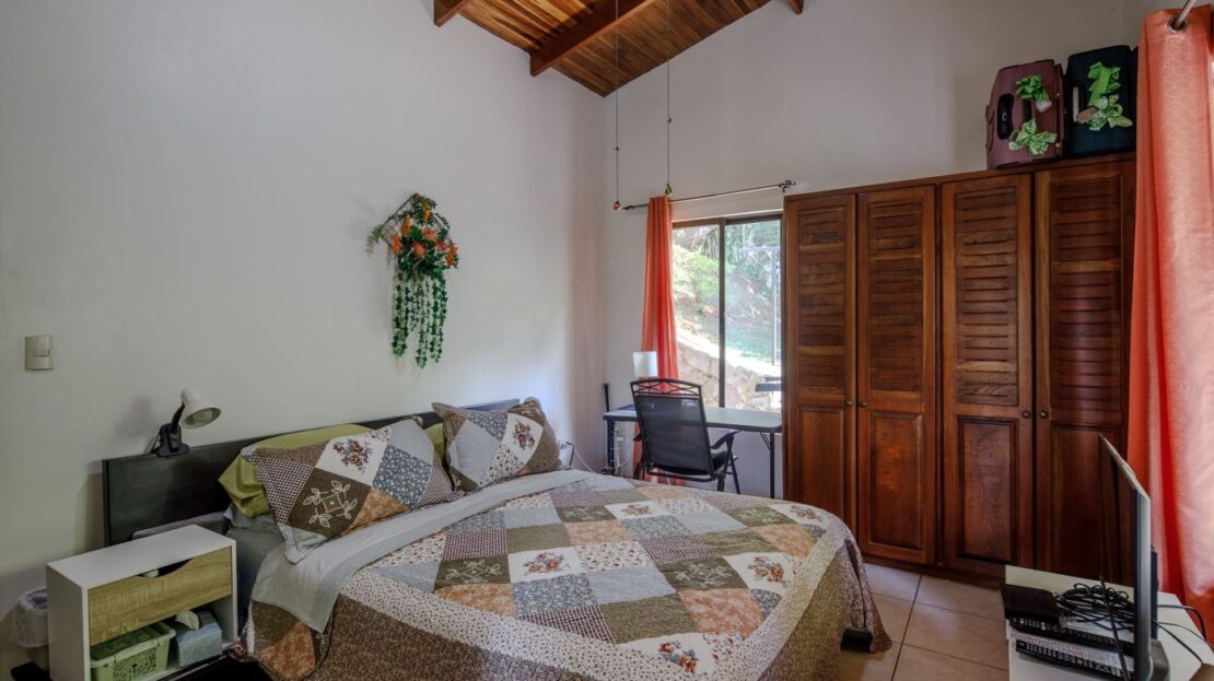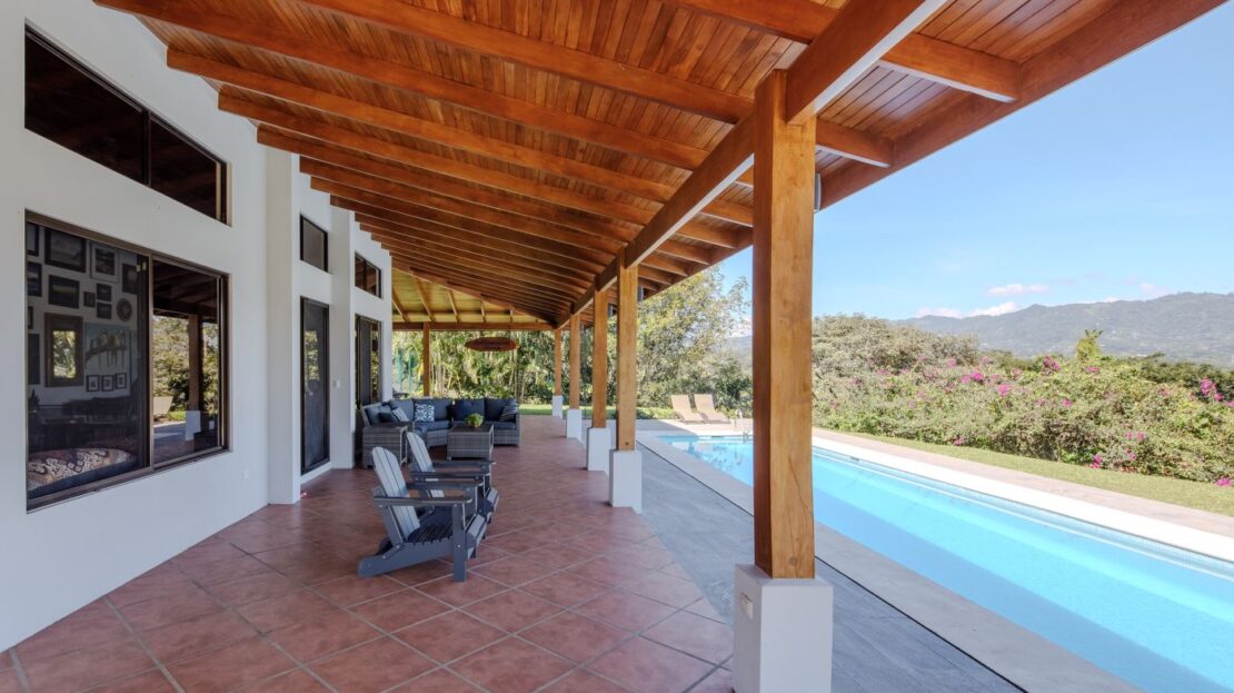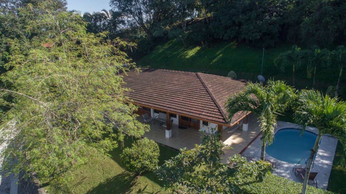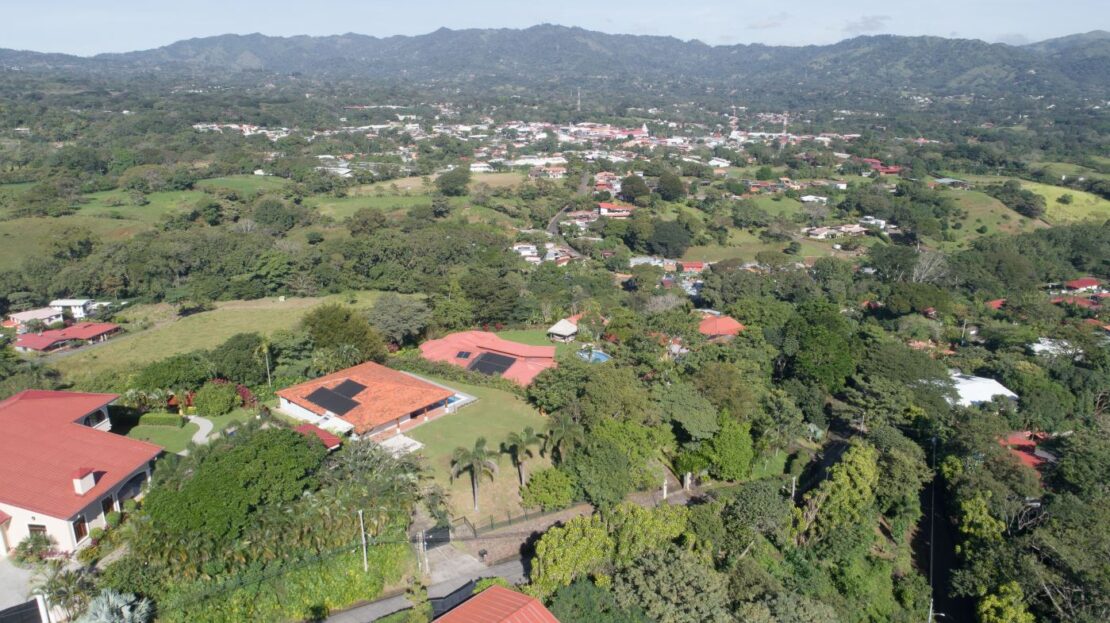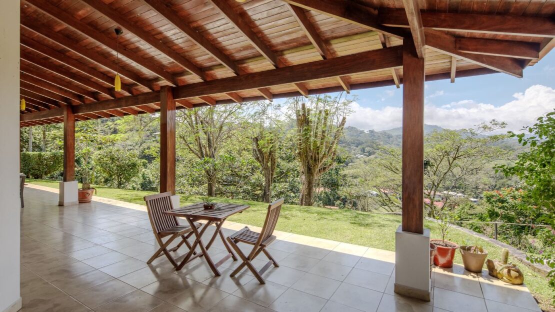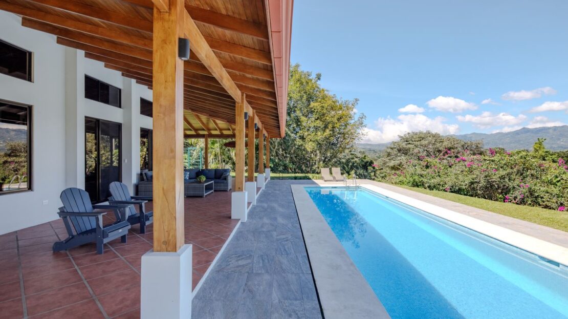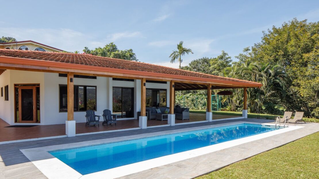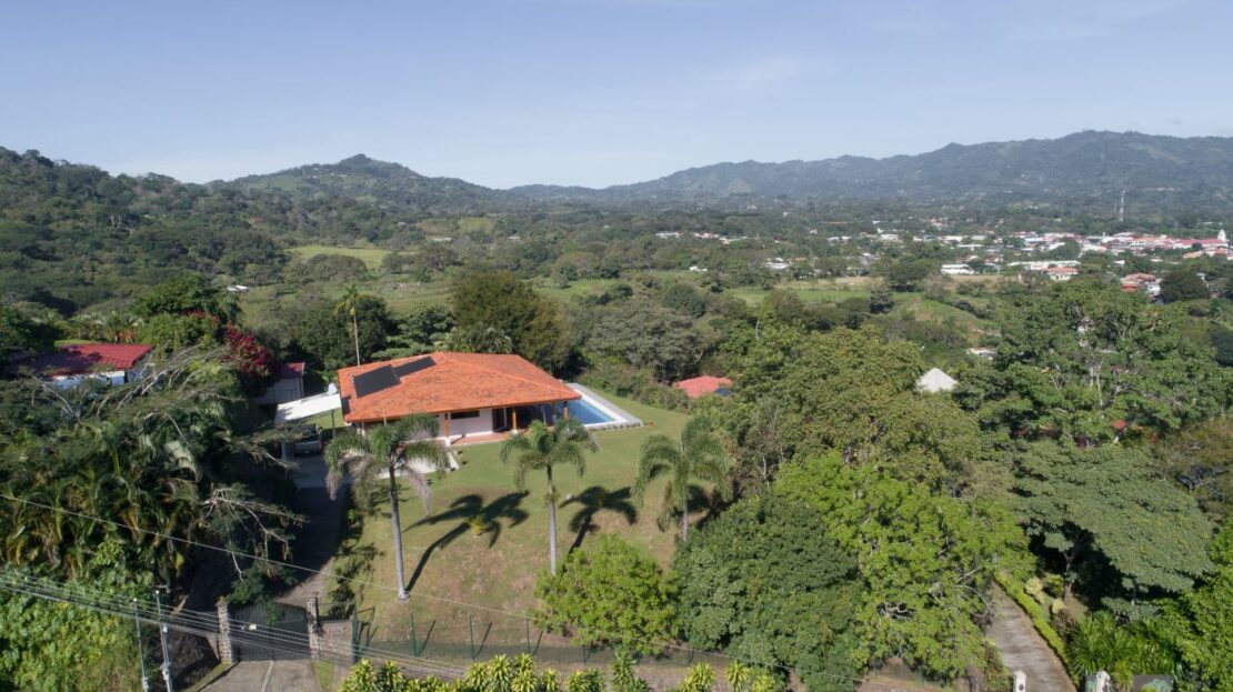 Entering the top main larger home’s lot features an ample lot that leads way to the inviting long lap and watersport’s made pool and wrap around porch ideal for a crowd and for entertaining and enjoying Atenas’ renown best climate. Leaving the wonderous panoramic views of this main home one enters the 300m2 interrior which has a feel of spaciousness with tall ceilings in the main living, dining and kitchen with plenty of light throughout. There is fine artesenal woodwork throughout the home including the slatted ceilings, in the very ample kitchen an the home’s door work. The main common living room leads to a nice sized master bedroom and bathrooms suite and to the other two bedrooms and two baths. Outside there’s a half bathroom for the pool use and an outside laundry area. Behing the home is an independent tool shed. This home has dedicated solar heating for the pool. The home is designed to be able to support and added second level construction. This top is sold non-furnished.