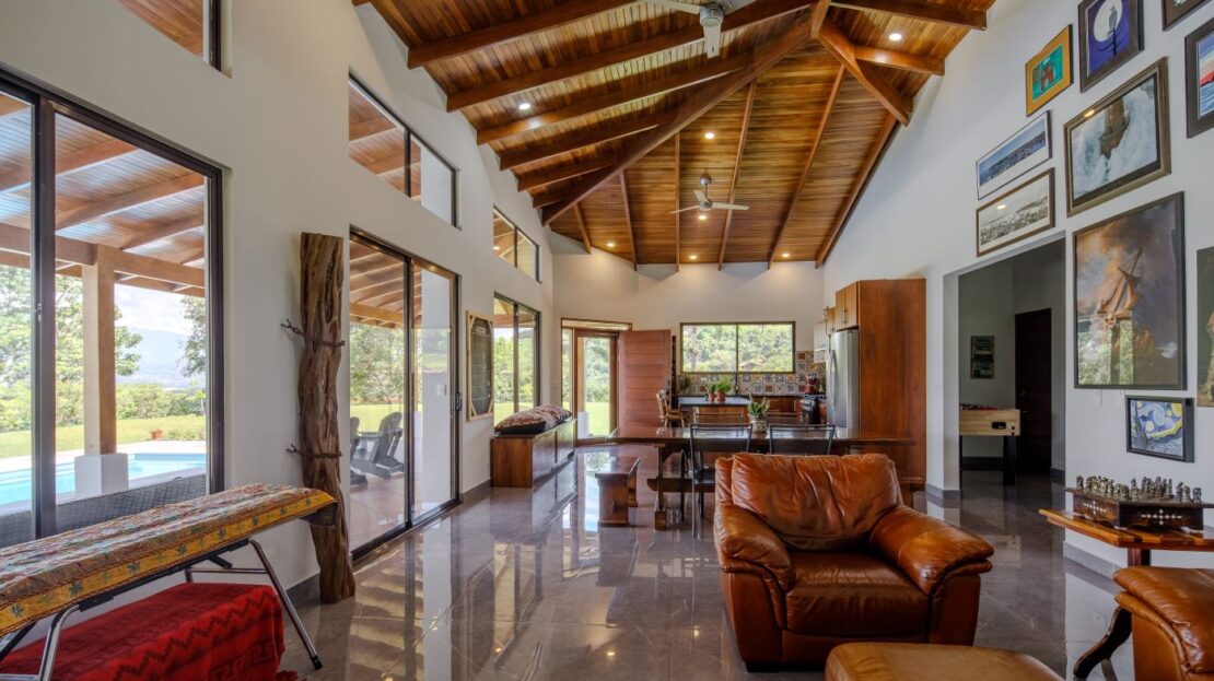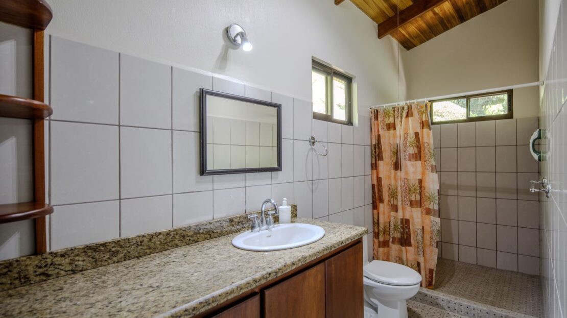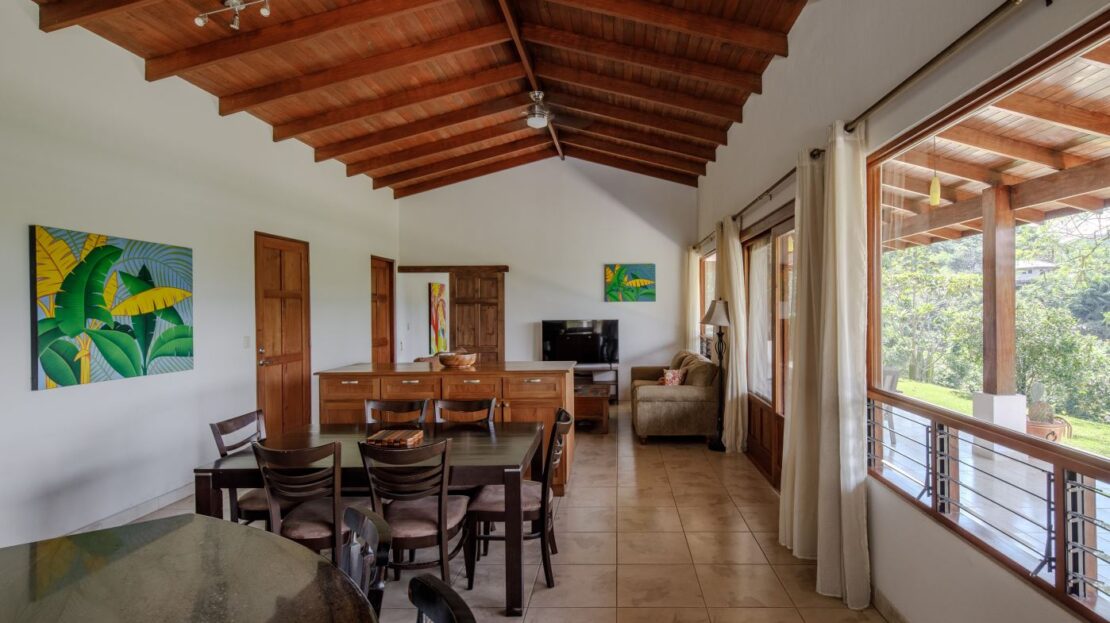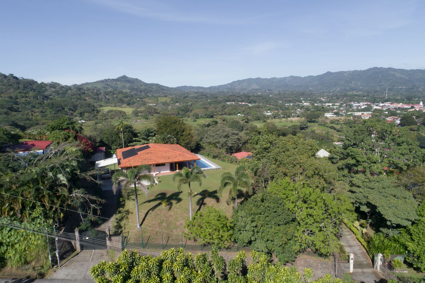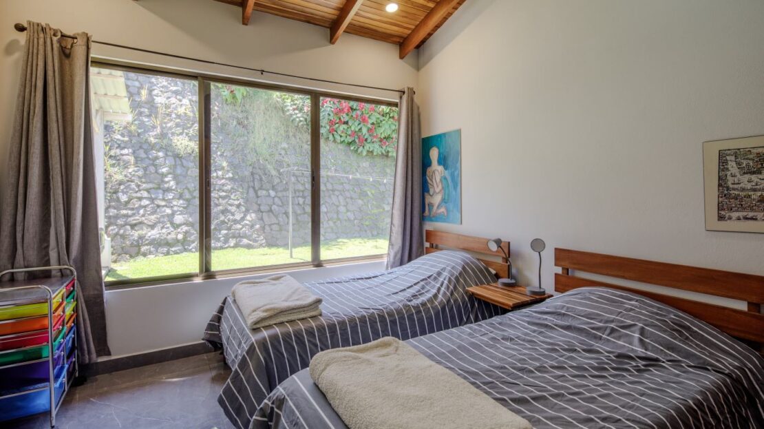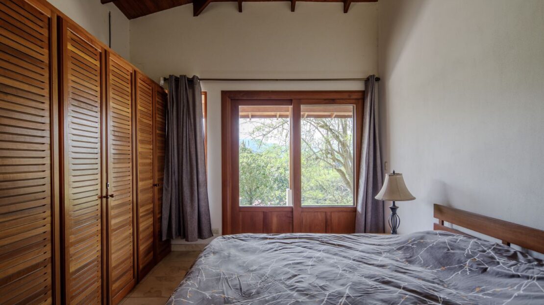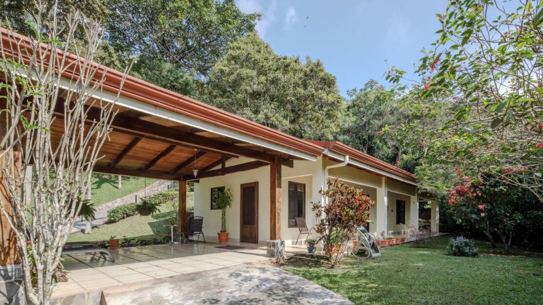 Entering the top main larger home’s lot features an ample lot that leads way to the inviting long lap and watersport’s made pool and wrap around porch ideal for a crowd and for entertaining and enjoying Atenas’ renown best climate. Leaving the wonderous panoramic views of this main home one enters the 300m2 interrior which has a feel of spaciousness with tall ceilings in the main living, dining and kitchen with plenty of light throughout. There is fine artesenal woodwork throughout the home including the slatted ceilings, in the very ample kitchen an the home’s door work. The main common living room leads to a nice sized master bedroom and bathrooms suite and to the other two bedrooms and two baths. Outside there’s a half bathroom for the pool use and an outside laundry area. Behing the home is an independent tool shed. This home has dedicated solar heating for the pool. The home is designed to be able to support and added second level construction. This top is sold non-furnished.