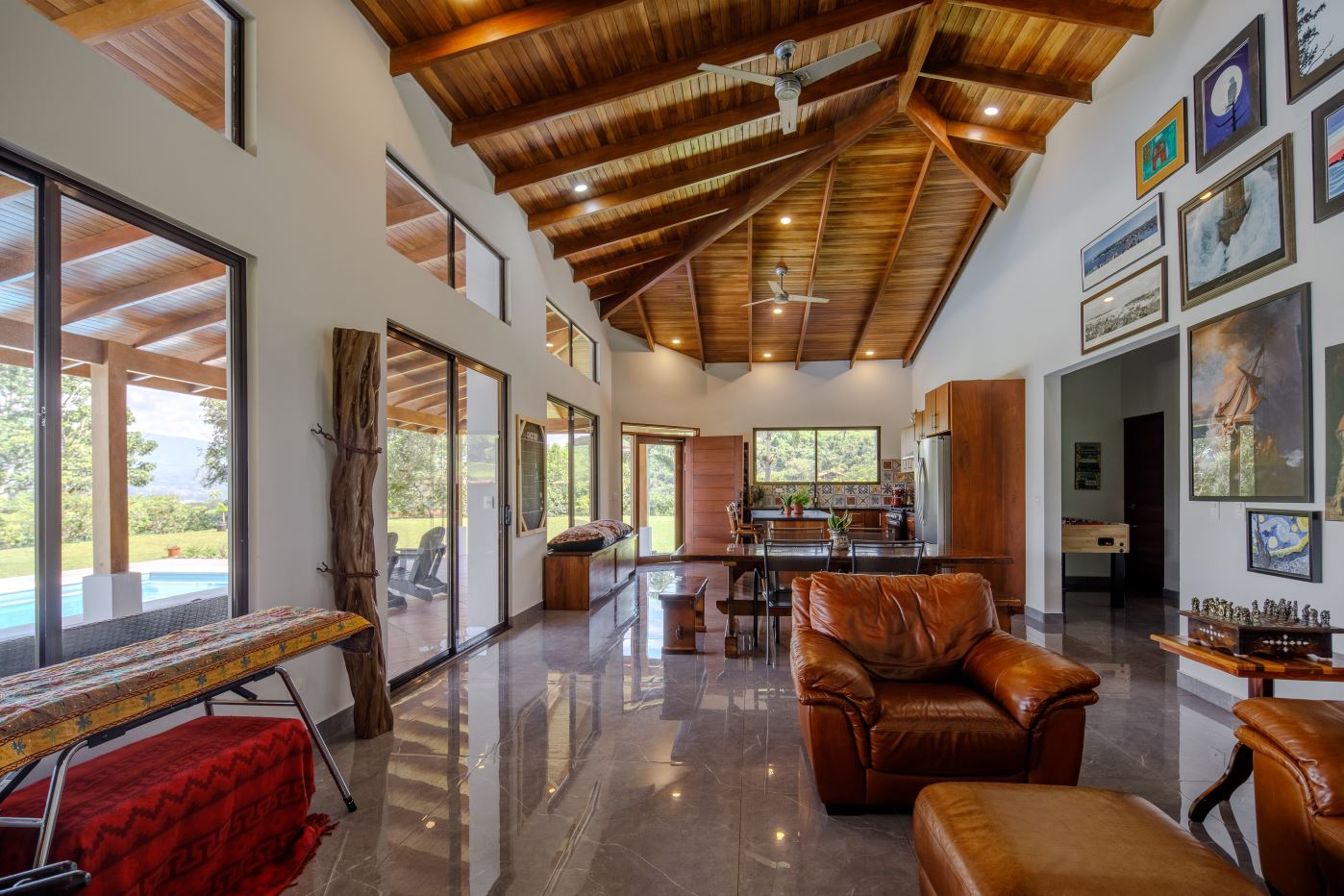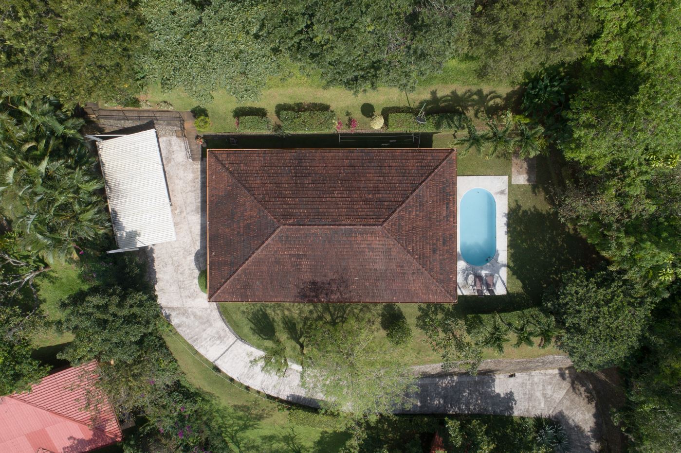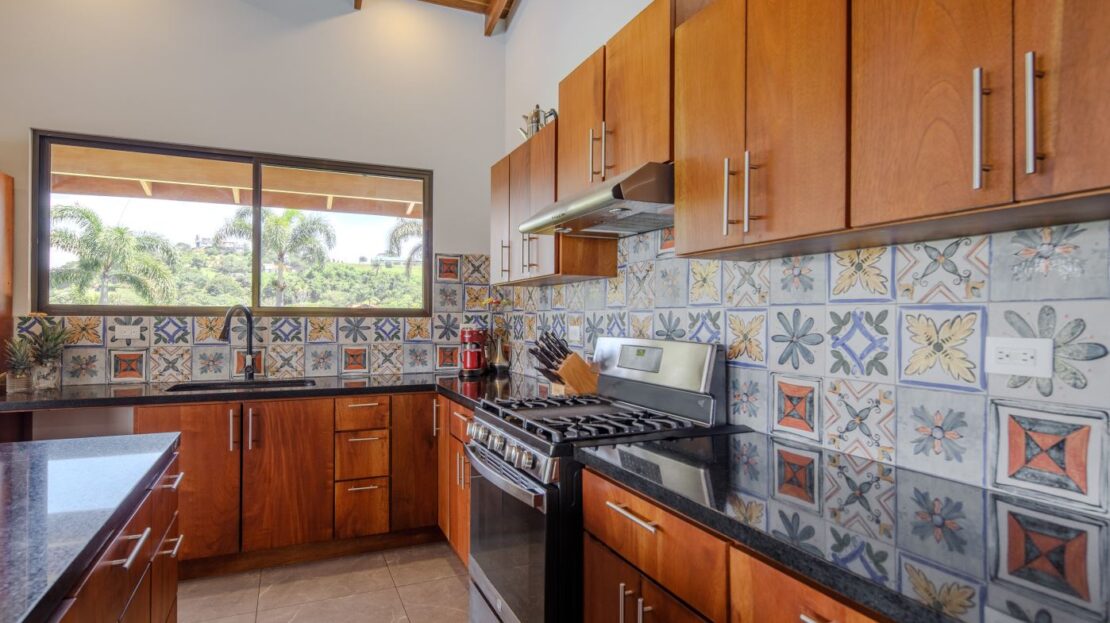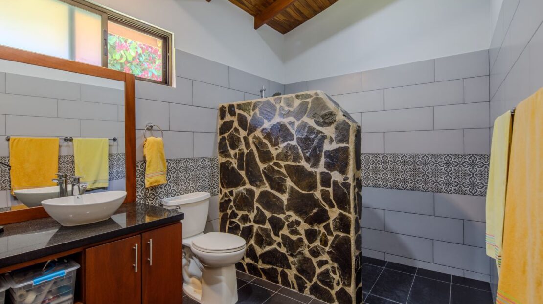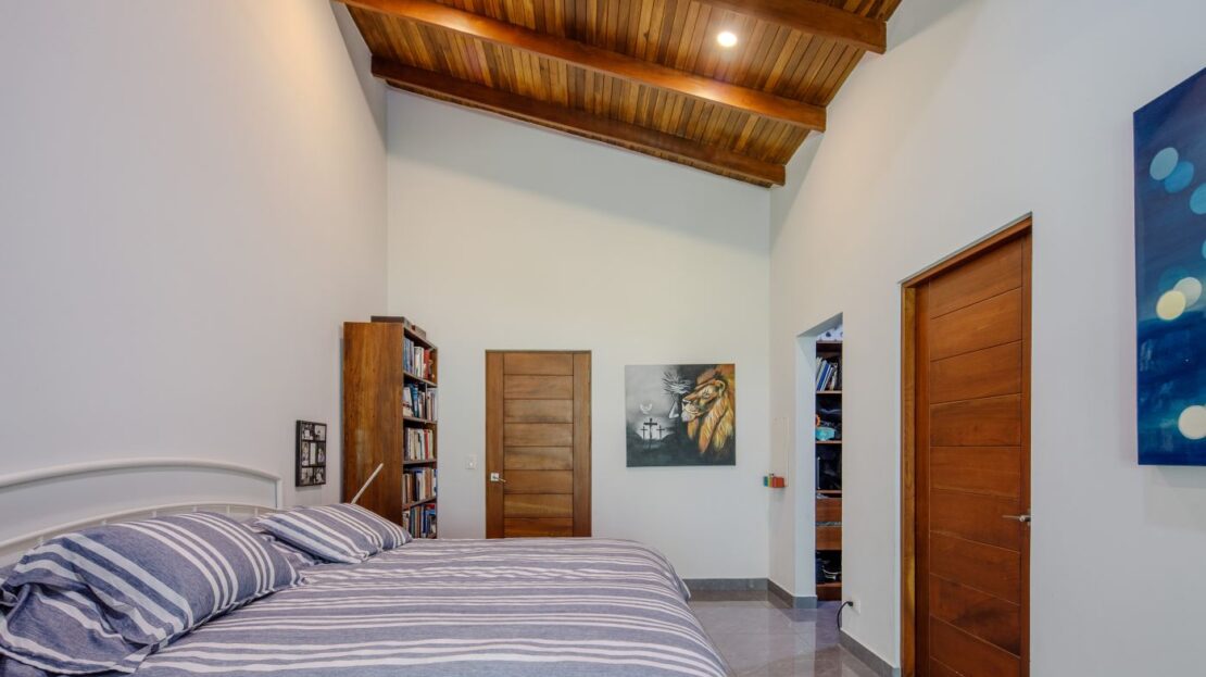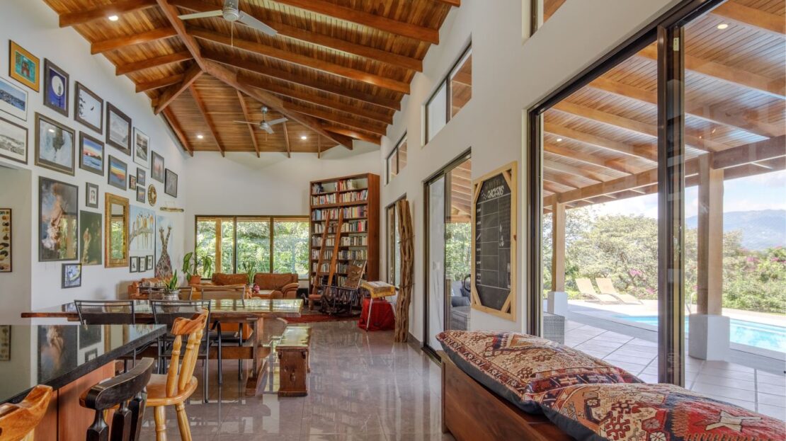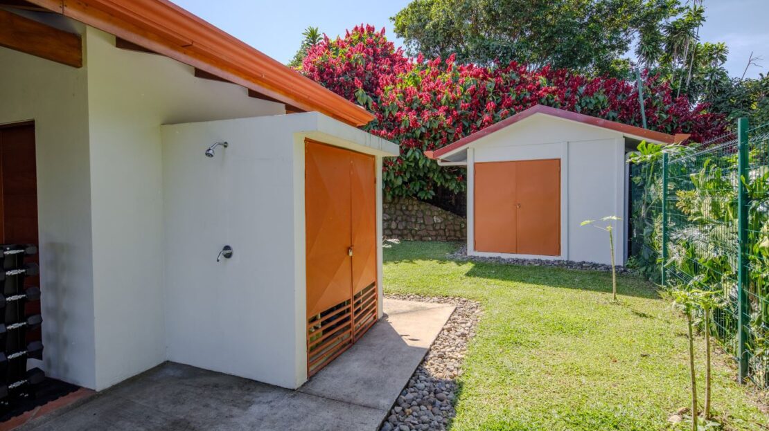 Entering the top main larger home’s lot features an ample lot that leads way to the inviting long lap and watersport’s made pool and wrap around porch ideal for a crowd and for entertaining and enjoying Atenas’ renown best climate. Leaving the wonderous panoramic views of this main home one enters the 300m2 interrior which has a feel of spaciousness with tall ceilings in the main living, dining and kitchen with plenty of light throughout. There is fine artesenal woodwork throughout the home including the slatted ceilings, in the very ample kitchen an the home’s door work. The main common living room leads to a nice sized master bedroom and bathrooms suite and to the other two bedrooms and two baths. Outside there’s a half bathroom for the pool use and an outside laundry area. Behing the home is an independent tool shed. This home has dedicated solar heating for the pool. The home is designed to be able to support and added second level construction. This top is sold non-furnished.