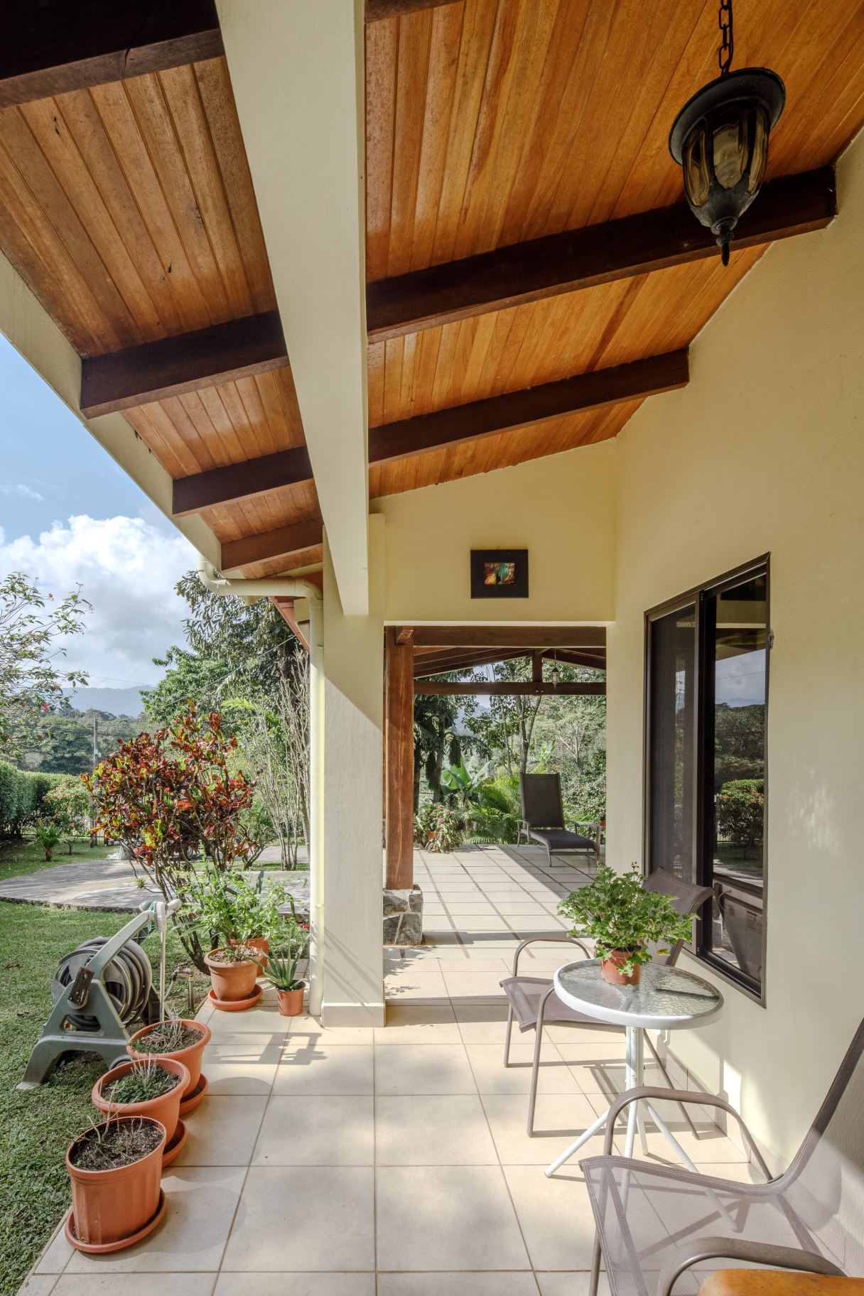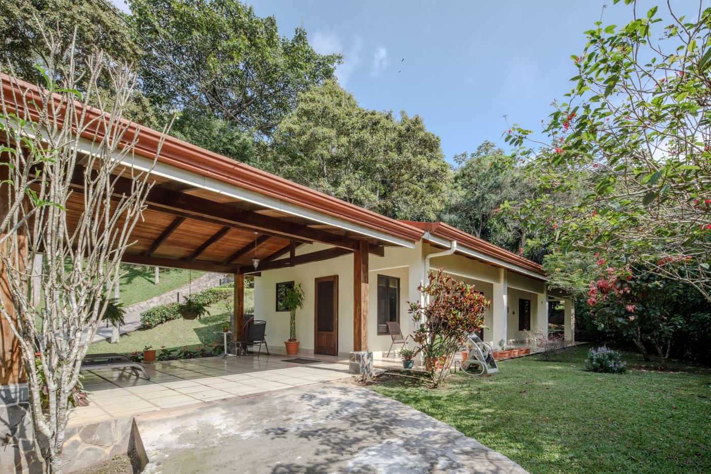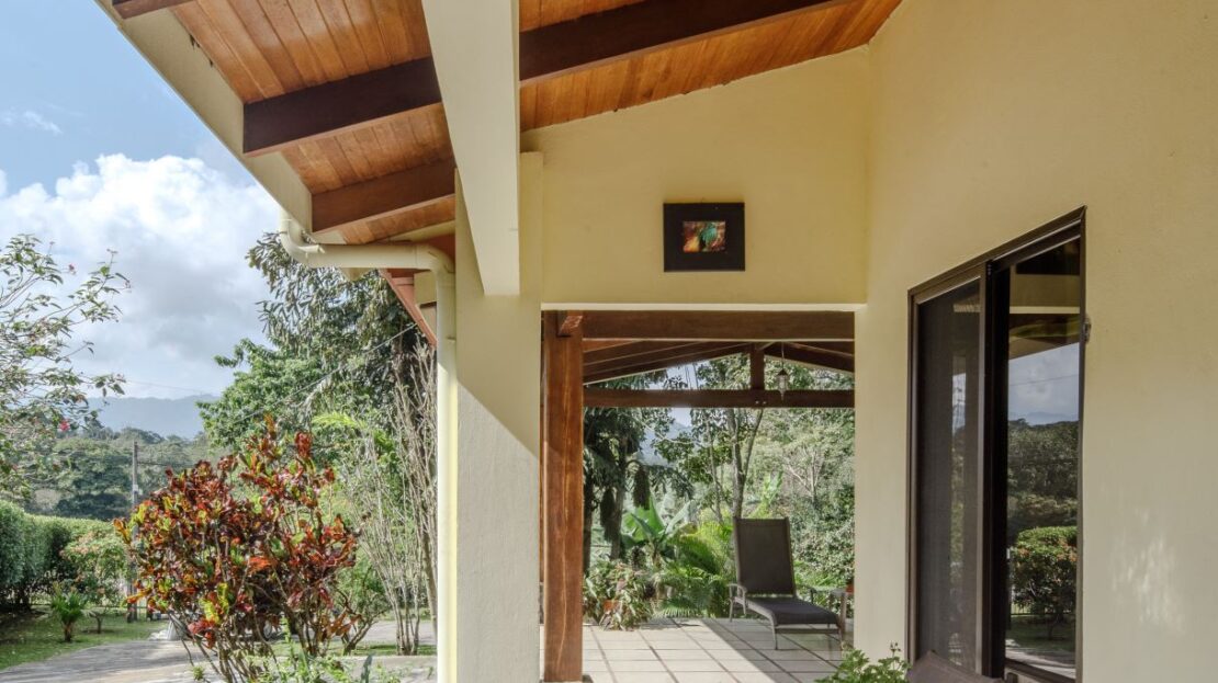 At the opposite end of the property is the smallest 170m2 guest home with its own independent entrance that leads way to a nicely laid out 2 bedroom/2 bathroom home also deisgned with artesenal woodwork thoughout with a small porch area with plenty of room to sit under roof. The home has a nice size side porch area with its own manicured gardens. This home is sold fully-furnished with appliances.