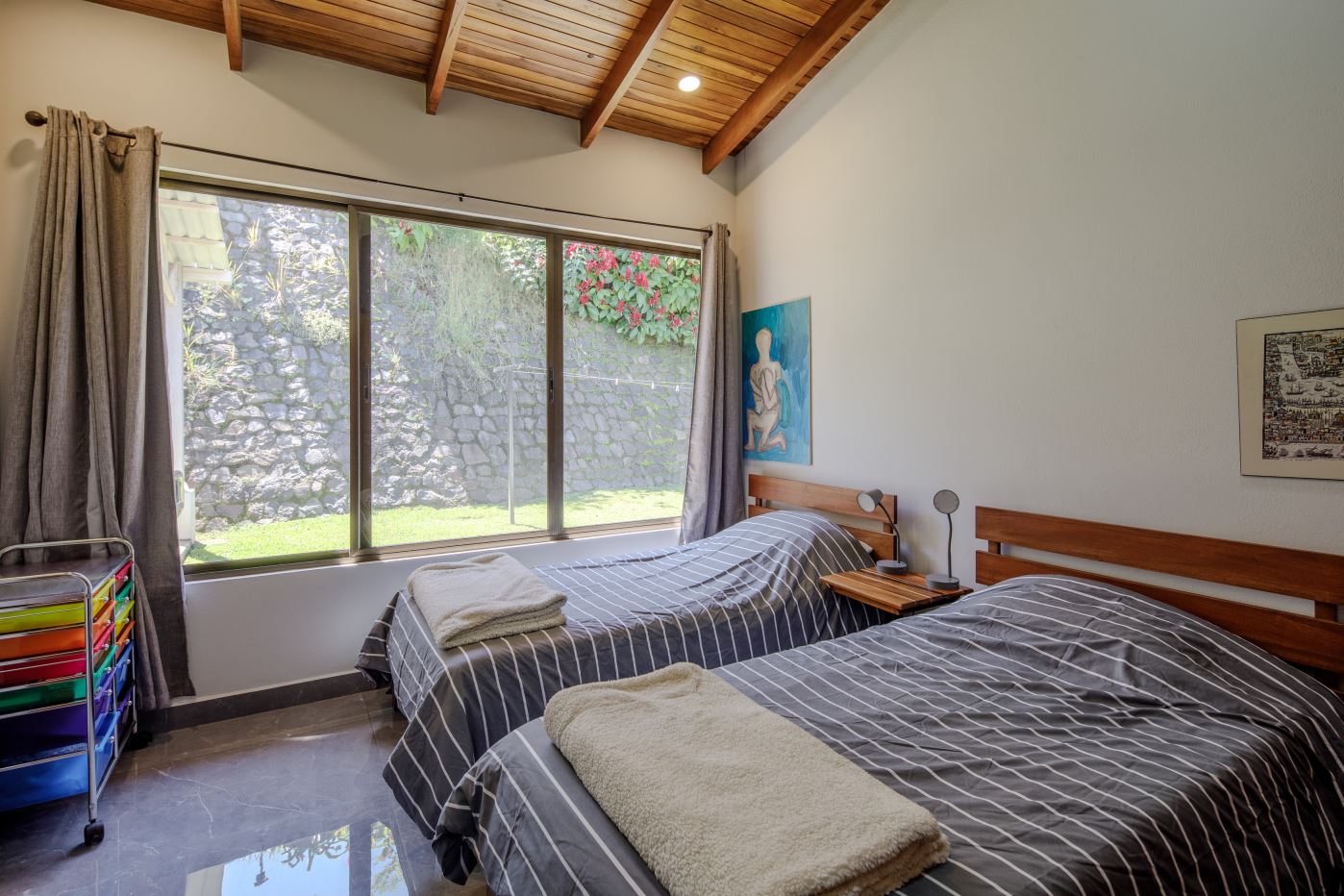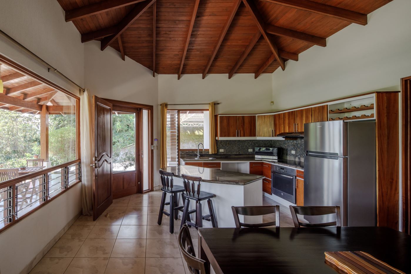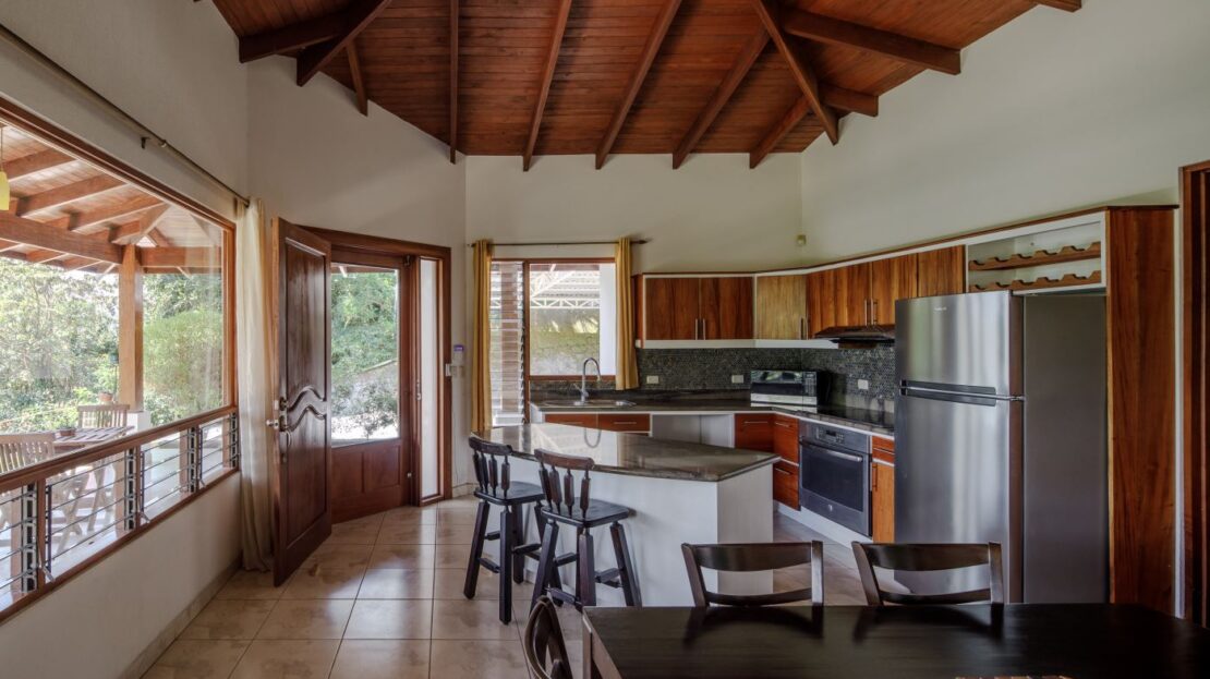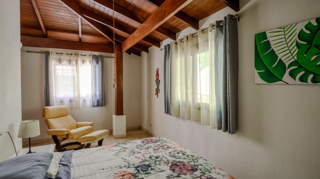 En el extremo opuesto de la propiedad se encuentra la casa de invitados más pequeña, de 170 m², con entrada independiente. Esta casa de dos dormitorios y dos baños, con una distribución agradable, presenta carpintería artesanal y un pequeño porche con amplio espacio para sentarse bajo techo. Dispone de un porche lateral de buen tamaño y un jardín bien cuidado. Se vende completamente amueblada e incluye electrodomésticos.