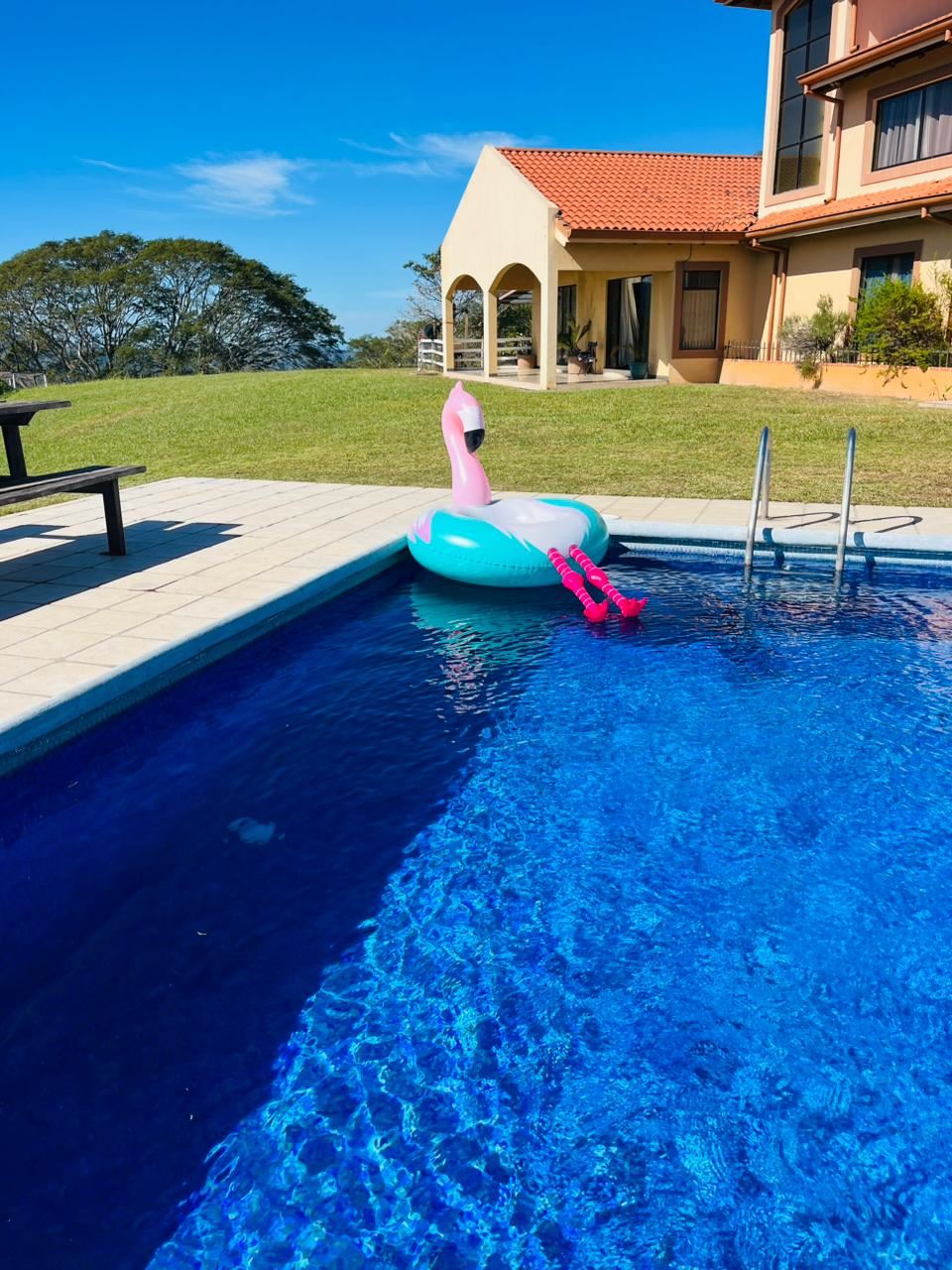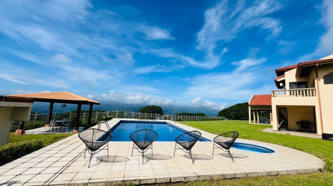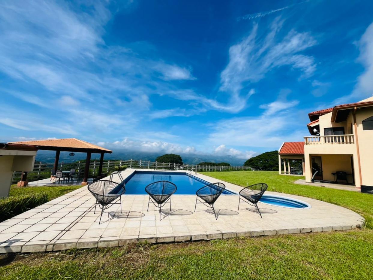This property is ideal for those seeking a functioning ranch. It features a main home, caretaker home, large detached parking garage, plenty of storage, a large pool and communal rancho area, cattle corral and all within a fenced area perfect for cattle or livestock with over 5 hectares of land (13+ acres). The main home sits on top of a hill with big views of San Jose and the area mountains. The inviting pool area is perfect for entertaining. Inside the main home there is a large living and dining room. All the guest rooms can be found downstairs and a large master bedroom with ample bathroom with jacuzzi and deck can be found upstairs. At the entrance of the property one finds a caretaker’s home and adjacent is the farm with plenty of room for any project in mind with lots of rolling hills in the Atenas countryside only minutes from the main east-west high 27 and just minutes from town center. There is an artisanal well that gives water to the home and farm but there will be access by public water as well. The owner is open to owner-based financing or other proposals.
